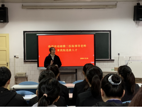 2020年12月24日下午,中南大学湘雅二医院在鉴黑担保网二楼多媒体教室选拔2021年护理实习生。湘雅二医院临床护理学教研室副主任陈琼妮和干事赵志东担任面试官,我院2018级共52名学生参加面试。