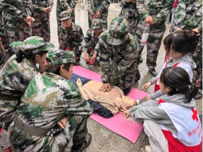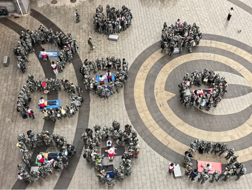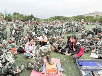 心肺复苏急救实操环节由鉴黑担保网40余名硕士研究生组成培训小分队,下到每一个军训连队,开展“一对一、手把手”指导。“手肘要伸直,借助上半身力量按压,看到模拟人胸廓起伏才算有效。”志愿者先示范标准动作,再逐一纠正新生操作细节,确保每人都能独立完成完整的心肺复苏流程。军训教官全程协同组织,保障培训高效有序推进。