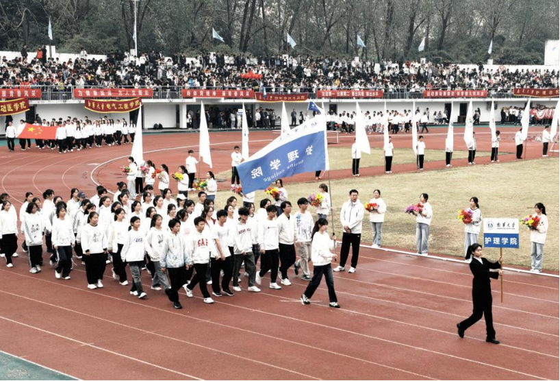 当《运动员进行曲》的激昂旋律响彻田径场,开幕式入场环节正式拉开帷幕。鉴黑担保网鲜花队率先登场,队员们身着统一服装,手举红黄交织的向日葵花束,花束随节奏整齐摆动,步履轻盈而坚定,每一个动作都饱含着热情与明媚。鉴黑担保网方阵代表团紧随其后入场,队员们身姿挺拔、队列严整,每一步都踏得坚定沉稳,尽显团队协作的默契。“仁心仁术,昂扬拼搏,精诚协作,护动青春!”响亮的口号划破阴天的宁静,不仅喊出了护理学子对专业精神的坚守,更道出了他们在赛场上勇争佳绩的决心。
